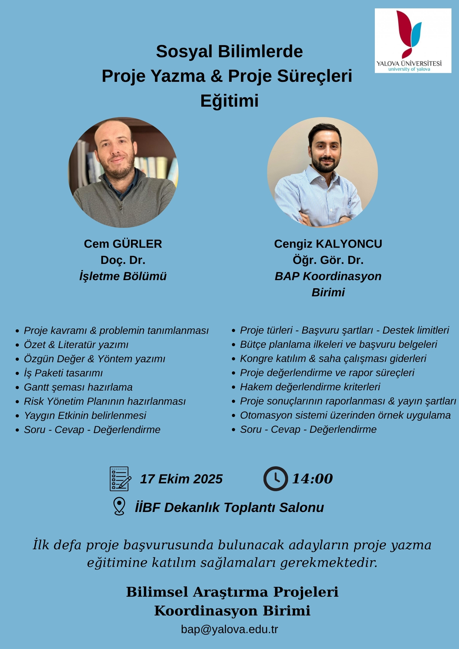 Sosyal Bilimler alanında proje başvurusunda bulunacak proje yürütücüsü adaylarımız için “Sosyal Bilimlerde Proje Yazma & Proje Süreçleri Eğitimi” verilecektir. İlk defa proje başvurusunda bulunacak adayların (Lisansüstü tez projesi hariç) proje yazma eğitimine katılım sağlamaları zorunludur. Tüm araştırmacılarımıza saygıyla duyurulur.