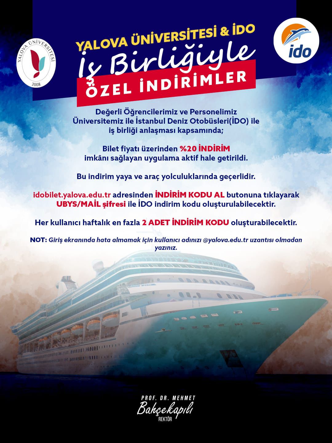 Yalova Üniversitesi ve İDO İşbirliğiyle Özel İndirim Duyurusu