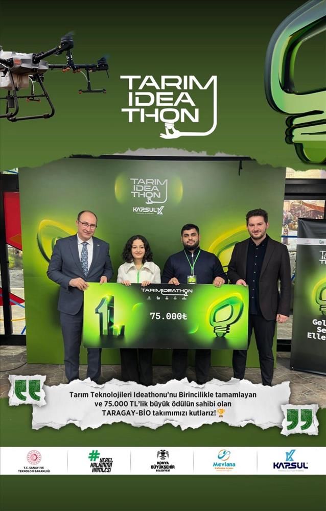 Konya Büyükşehir Belediyesi Kapsül Teknoloji Platformu ve Mevlana Kalkınma Ajansı (MEVKA) iş birliğiyle düzenlenen “Tarım Teknolojileri Ideathonu” büyük finalinde, fakültemiz öğrencilerinin yer aldığı TARAGAY-BİO takımı, 75.000 TL değerindeki Birincilik Ödülü’nün sahibi oldu.