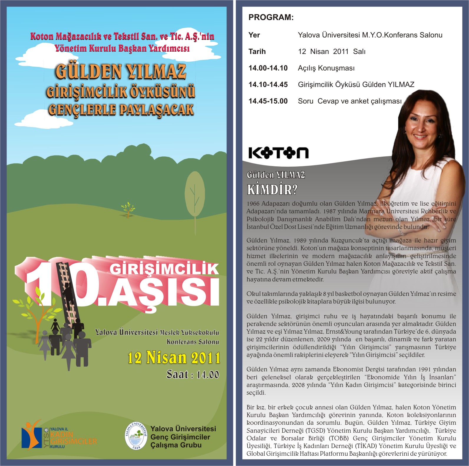 Yalova Ticaret ve Sanayi Odası Kadın Girişimciler Kurulu ile Yalova Üniversitesi Genç Girişimciler Çalışma Grubu ortaklığı ile düzenlenen Girişimcilik Aşısı konferanslarının onuncusu 12 Nisan Salı günü gerçekleştirilecektir. Gülden Yılmaz'ın konuşmacı olarak katılacağı konferansa tüm ilgililer davetlidir.