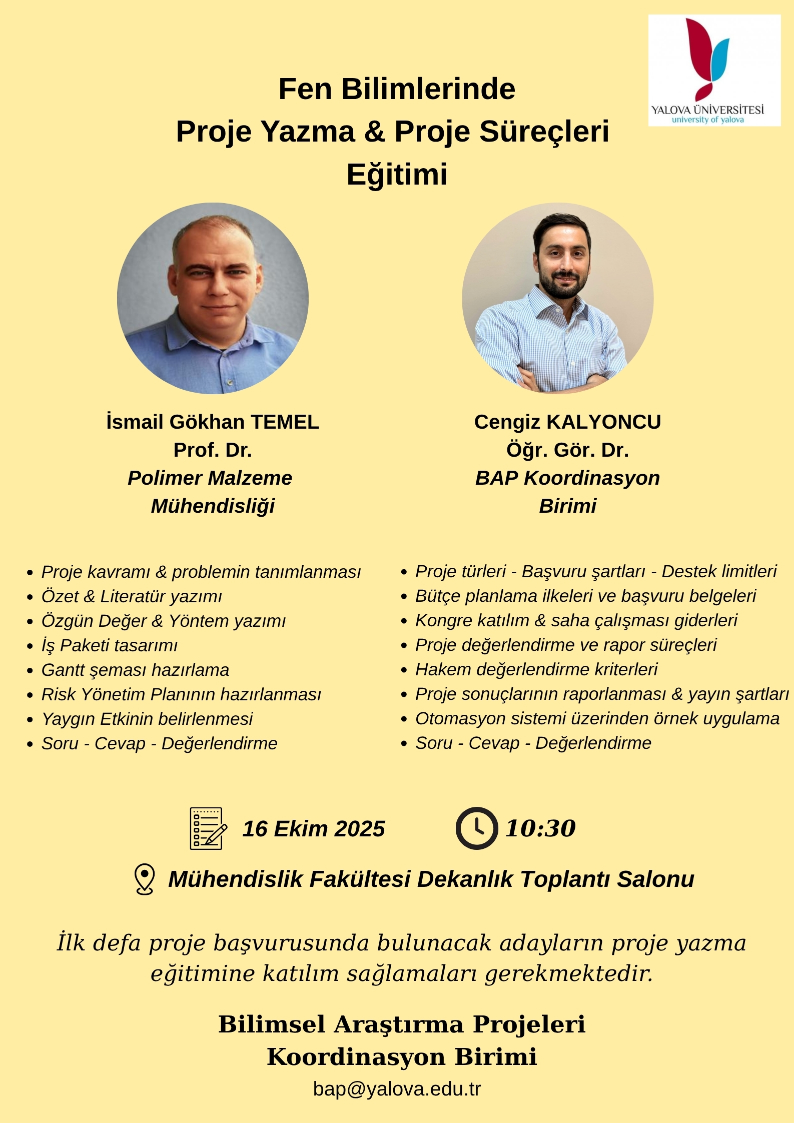 Fen Bilimleri alanında proje başvurusunda bulunacak proje yürütücüsü adaylarımız için “Fen Bilimlerinde Proje Yazma & Proje Süreçleri Eğitimi” verilecektir. İlk defa proje başvurusunda bulunacak adayların (lisansüstü tez projesi hariç) proje yazma eğitimine katılım sağlamaları zorunludur. Tüm araştırmacılarımıza saygıyla duyurulur.