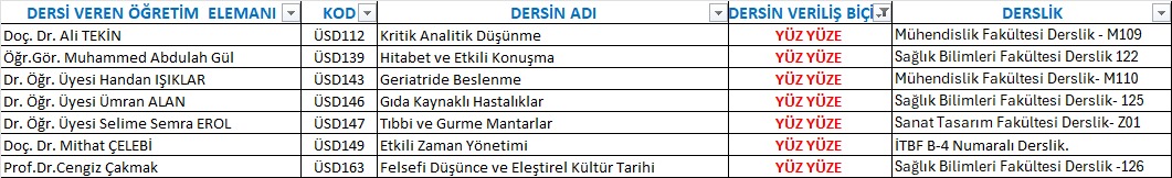 Üniversitemizde güz dönemi kapsamında açılan seçmeli dersler aşağıda listelenmiştir. Dersler yüz yüze yapılacak olup, derslik bilgileri tabloda yer almaktadır.