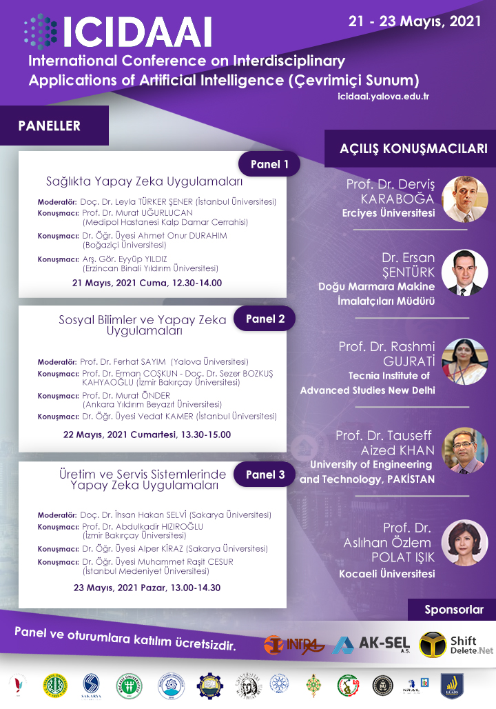 Yalova üniversitesinin ev sahipliğinde gerçekleşen, 12 üniversitenin de paydaşı olduğu Uluslararası yapay Zeka Uygulamaları Konferansı (International Conference on Interdisciplinary Applications of Artificial Intelligence – ICIDAAI) 21-23 Mayıs 2021 tarihlerinde, gerçekleşecek.