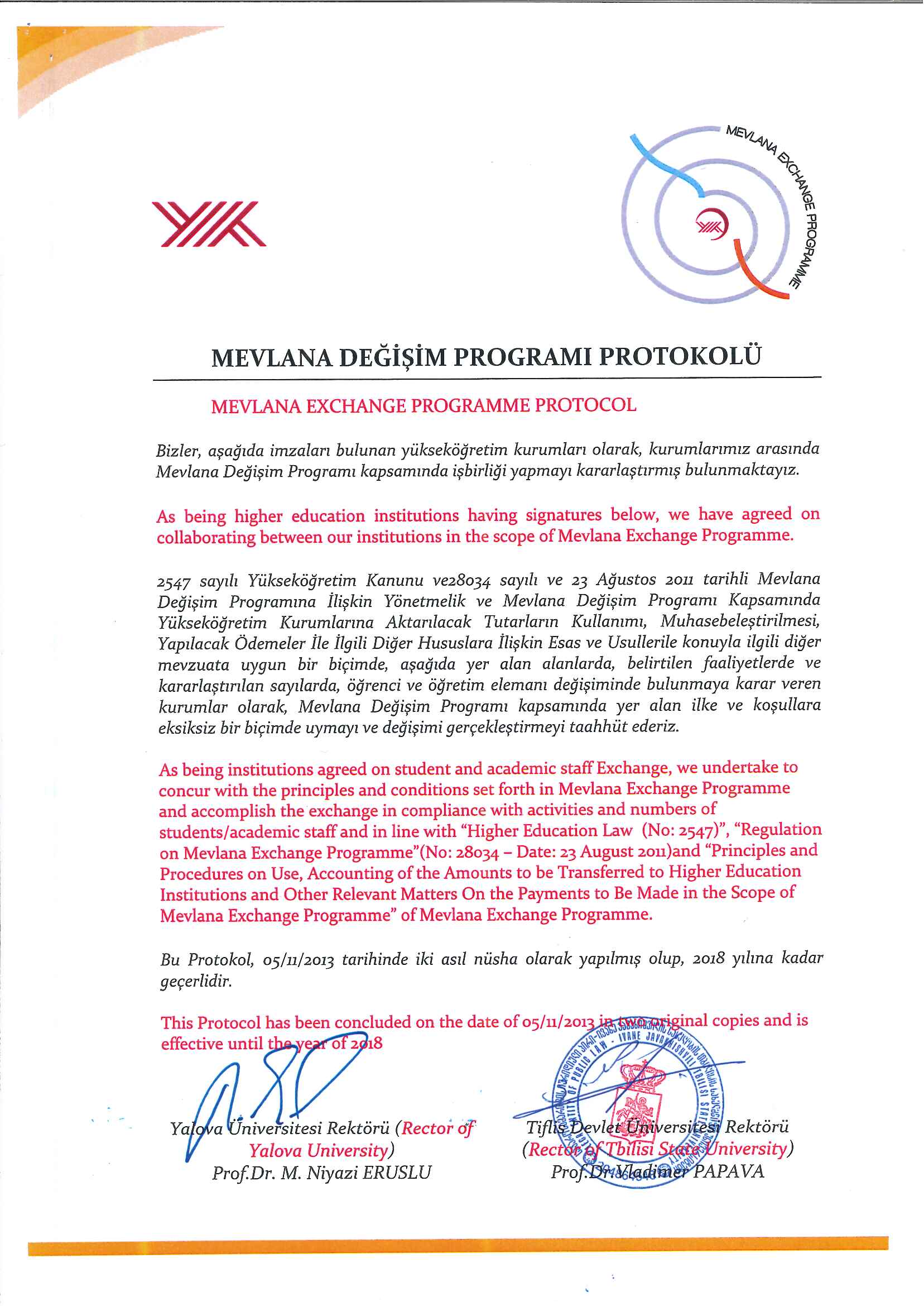 Yalova Üniversitesi-Tiflis Devlet Üniversitesi Arası Mevlana Protokolü Aşağıda Sunulmuştur.