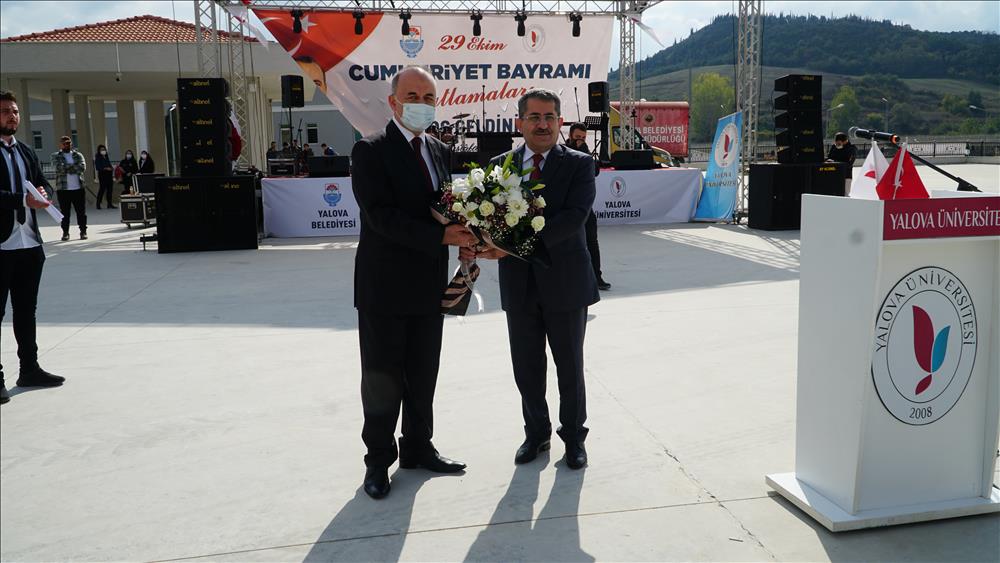 Konuşmasını gençlerin ve tüm Yalovalıların 29 Ekim Cumhuriyet Bayramı’nı yürekten kutladığını belirterek tamamlayan Prof. Dr. Suat Cebeci, üniversitemizin gerçekleştirdiği tüm etkinliklere yoğun programına rağmen icabet eden Yalova Valisi Muammer Erol’a teşekkürlerini ifade ederek kendilerine çiçek takdim etti.